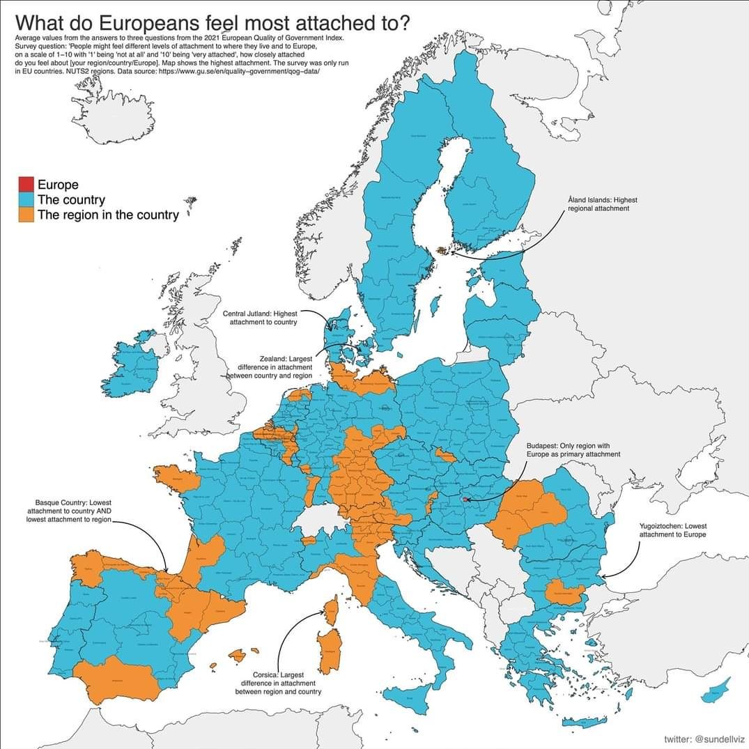 Anketno pitanje: ‘Ljudi mogu osjećati različite razine privrženosti mjestu gdje žive i Europi, na ljestvici od 1 do 10, pri čemu’ 1 ‘nije’ uopće ‘, a’ 10 ‘je vrlo vezano,’ koliko su blisko povezani osjećate (vaša regija/zemlja/Europa). Ova karta pokazuje najveću privrženost u zemljama EU.