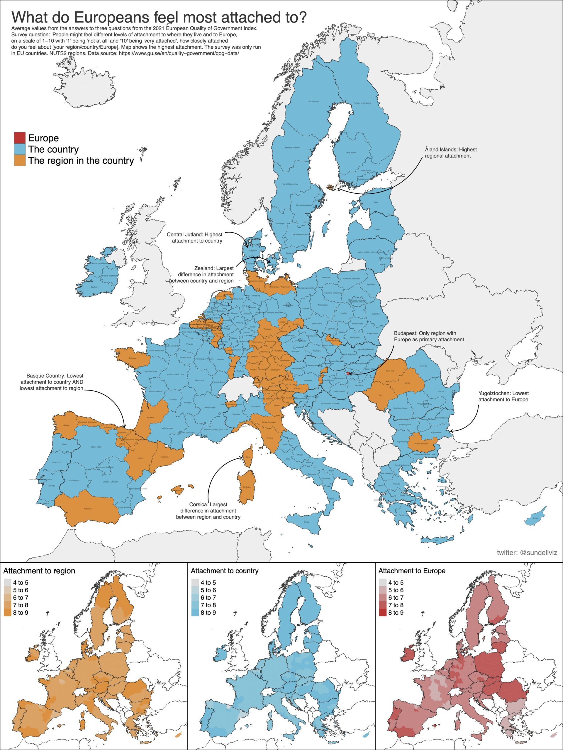 Najjači regionalni identitet imaju Allandski otoci, najslabiji nacionalni Baskija. Korzika ima najveću razliku između regionalnog i nacionalnog identiteta, a u centralnoj Danskoj je najjači nacionalni identitet. Treba napomenuti da je istraživanje rađeno na NUTS2 regijama što znači da su u slučaju Hrvatske Istra, Kvarner i Dalmacija pomiješane u jednu regiju.