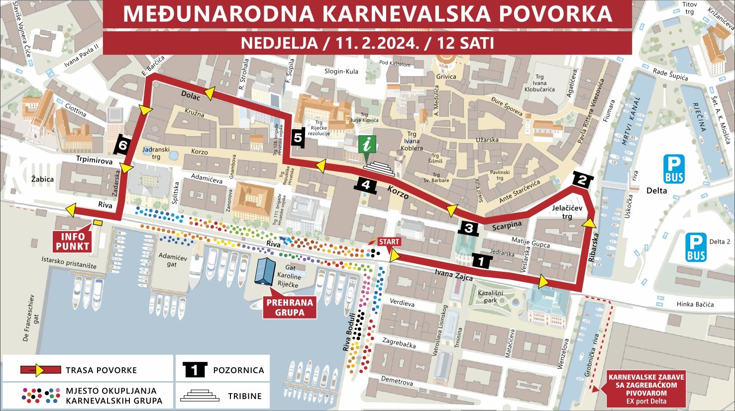 Na dan održavanja Međunarodne karnevalske povorke u nedjelju 11. veljače, u vremenu od 10:00 h do 23:00 sata, zabranit će se prometovanje svim vozilima na području užeg središta grada Rijeke, omeđeno ulicama: Ulica Riva – Ulica Riva Boduli – Ulica Ivana Zajca – Ribarska ulica – Ulica Fiumara – Scarpina ulica – Ulica Dolac – Ulica Erazma Barčića – Ciottina ulica – Adamićeva ulica – Jadranski trg – Trpimirova ulica – Zadarska ulica i u svim ulicama na području između Korza, odnosno Scarpine ulice i obale.