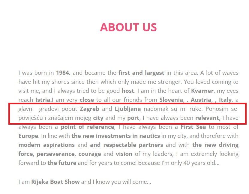 Organizatori Rijeka Boat Show pokrenuli su službenu stranicu o sajmu kako bi zainteresirani dobili osnovne informacije. Stranica ima i engleski prijevod, ali mogli bismo reći da je riječ o – poluprijevodu. Primjerice, vidljivo je da tekst nije u potpunosti preveden pa rečenice počinju na engleskom jeziku, a završavaju na hrvatskom jeziku.