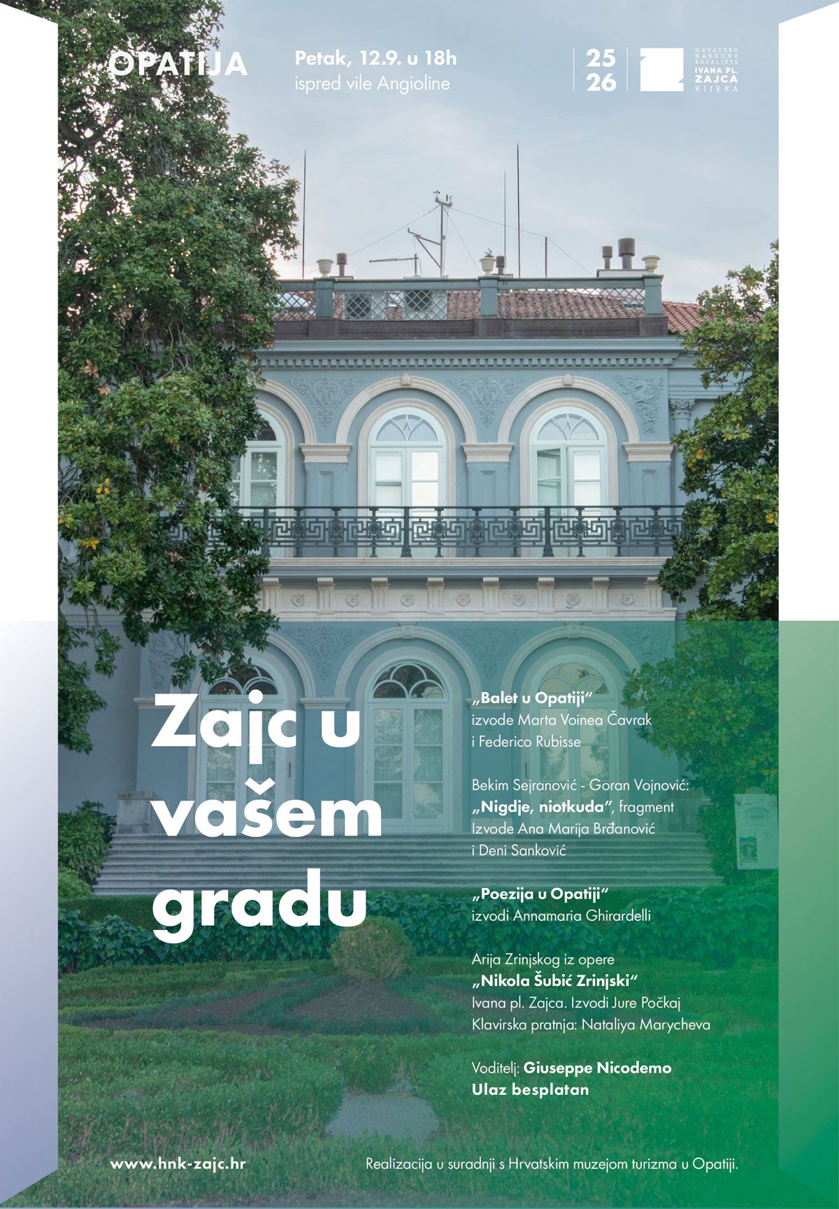 Nakon uspješnog projekta „Zajc u vašem kvartu“, Hrvatsko narodno kazalište Ivana pl. Zajca pokreće novi program pod nazivom „Zajc u vašem gradu“. Cilj je približiti kazalište publici izvan Rijeke i predstaviti ga u gradovima i općinama Primorsko-goranske županije. Prva postaja je Opatija, gdje program kreće u petak, 12. rujna 2025., u 18 sati ispred vile Angioline.
