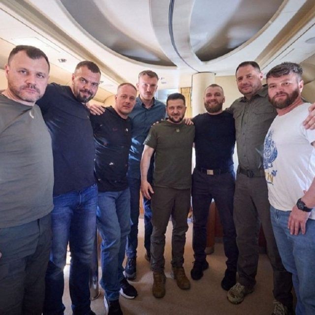 Zelenski se u Ukrajinu vratio s ukrajinskim vojnicima Denisom Prokopenkom, Svjatoslavom Palamarom, Sergijem Volinskijem, Olehom Khomenkom i Denisom Shelhom. Zelenski je izgrlio svakoga od njih nakon što su sletjeli u Kijev.