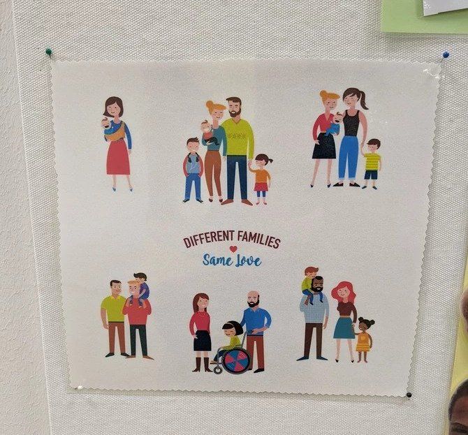 U igraonici jednog dječjeg vrtića u Finskoj postavljena je ilustracija “Različite obitelji – ista ljubav” koja prikazuje šest tipova obitelji.