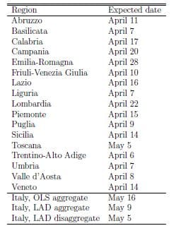 Prema statističkim izračunima koje je objavio Einaudijev institut za ekonomiju i financije (Eief), na temelju podataka od 29. ožujka, procjenjuju se za svaku regiju, iz koje proizlazi da bi 6. travnja Trentino Alto Adige trebao biti prva regija su nula slučajeva, a 7. travnja slijedili su Ligurija, Umbrija i Bazilikata, a zatim Valle d’Aosta (8), Puglia (9. travnja), Friuli Venezia Giulia (10. travnja), Abruzzo (11), Veneto i Sicilija (14. travnja), Pijemont (15), Lazio (16), Kalabrija (17), Kampanija (20), Lombardija (22), Emilia Romagna (28), Toskana (5. svibnja).