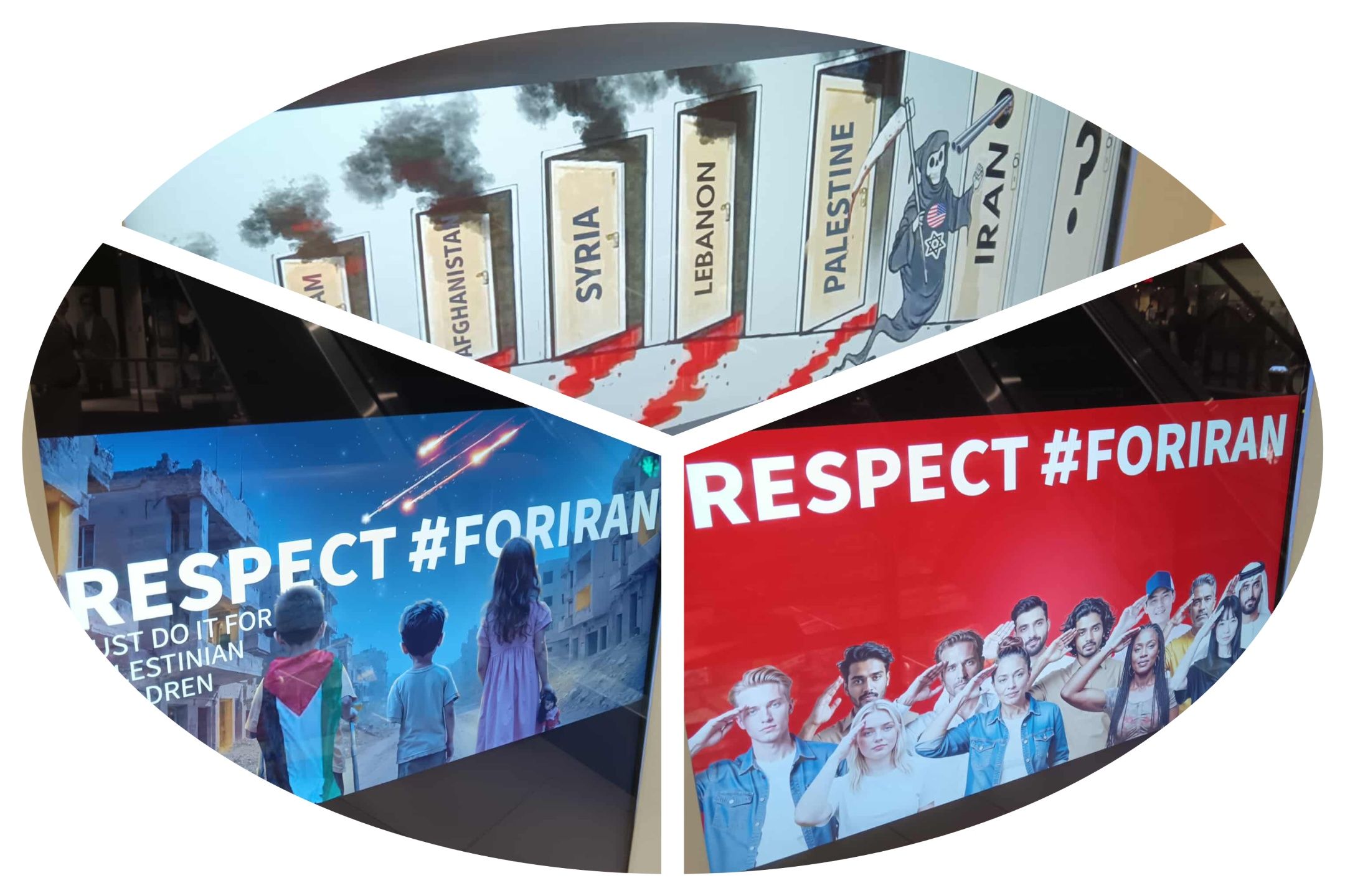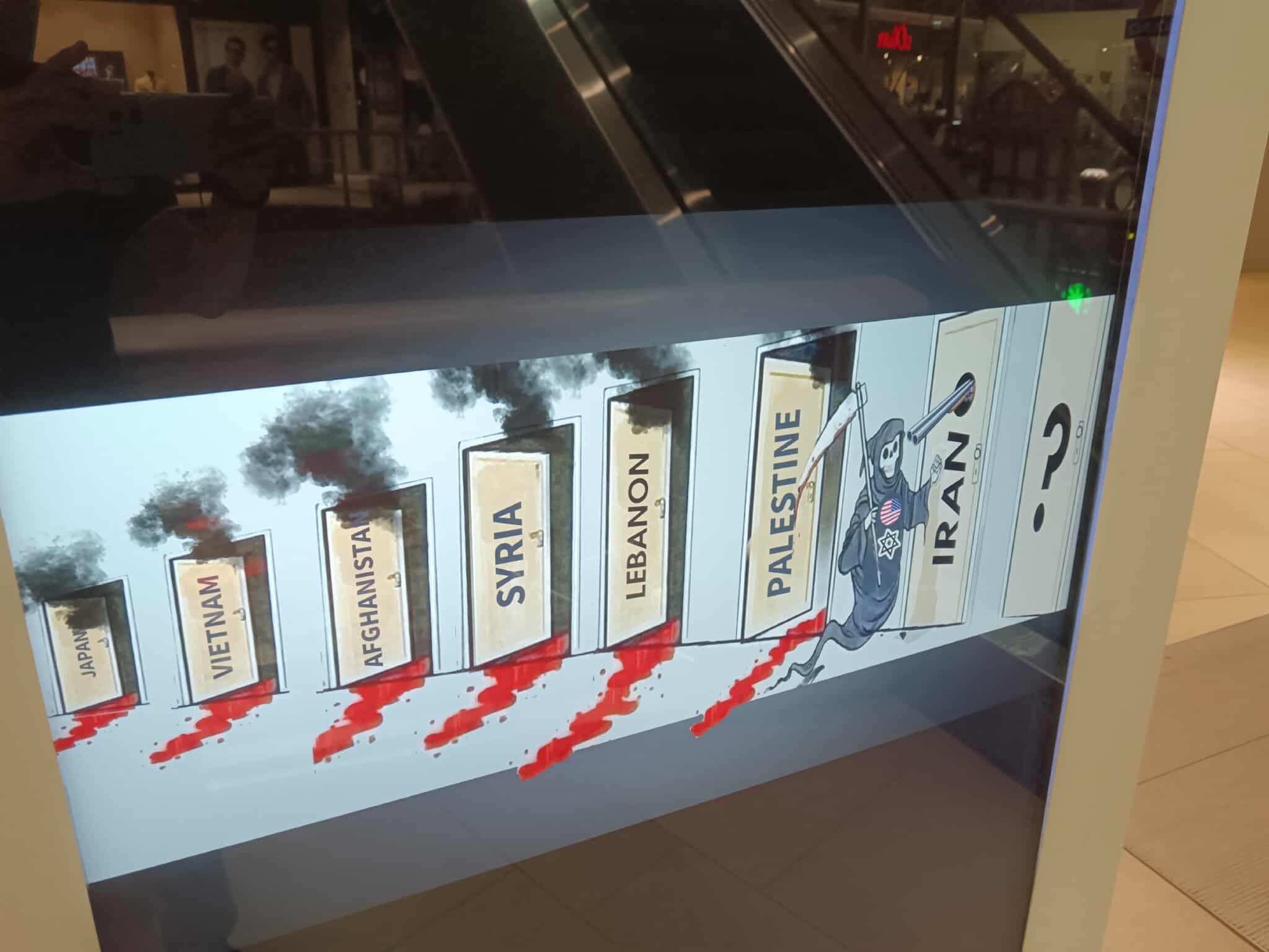 Na jednom od ekrana prikazana je ilustracija niza vrata s imenima zemalja poput Japana, Vijetnama, Afganistana, Sirije, Libanona, Palestine i Irana, uz krvavi trag koji vodi do figure smrti u crnoj odjeći sa simbolima SAD-a i Izraela. Drugi vizuali pozivali su na solidarnost s Iranom i palestinskom djecom, uz poruku “Respect #ForIran”.