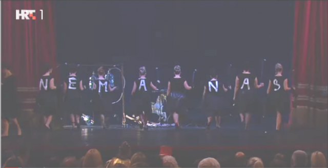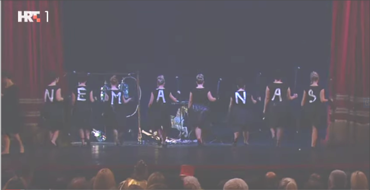No, ključni umjetnički trenutak cjelokupnoga otvaranja EPK dogodio se netom nakon izvedbe himne. Što je bilo vidljivo i u televizijskome prijenosu Okrenuvši se kako bi izašli s pozornice na leđima decentnih kostima neočekivano se pojavio natpis „NEMA NAS“. Kao što će se u kasnijoj ‘Operi industriale’ nizati digitalne poruke, tako se pojavio natpis „na tijelima“ izvođačica.